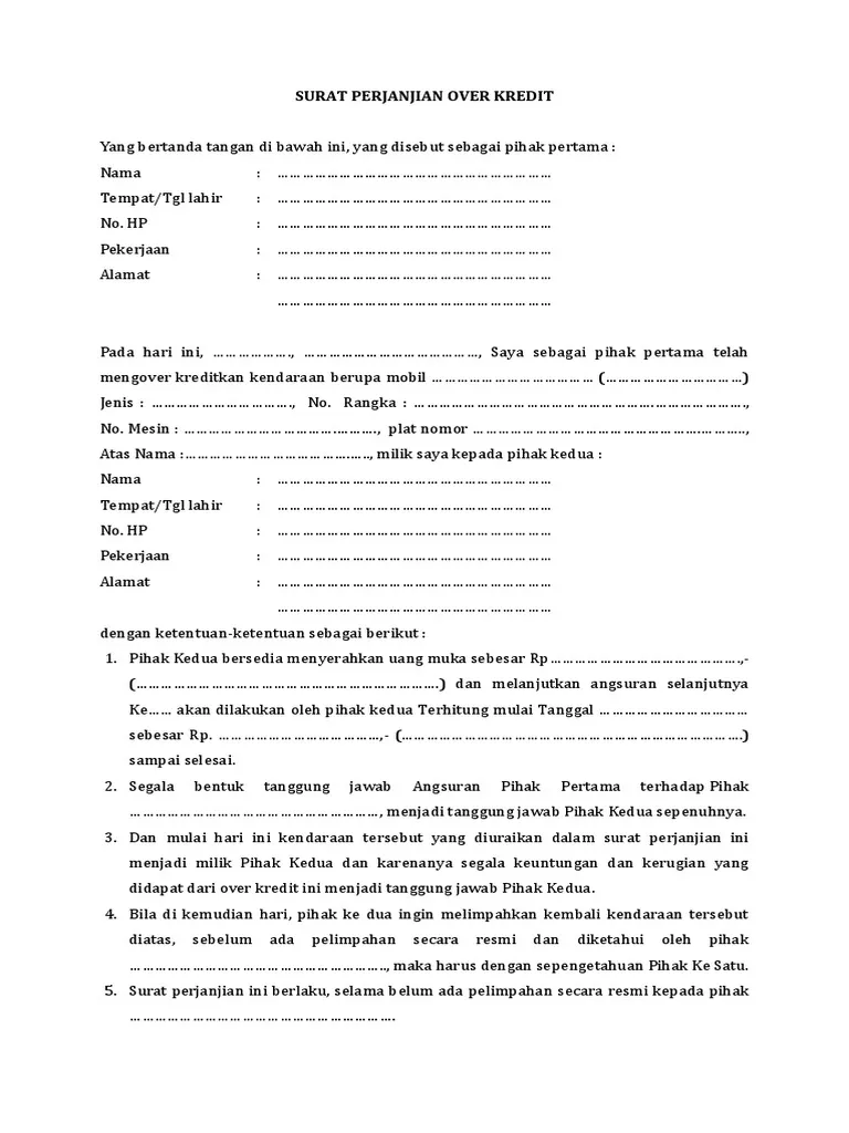 Contoh Surat Perjanjian Over Kredit Mobil