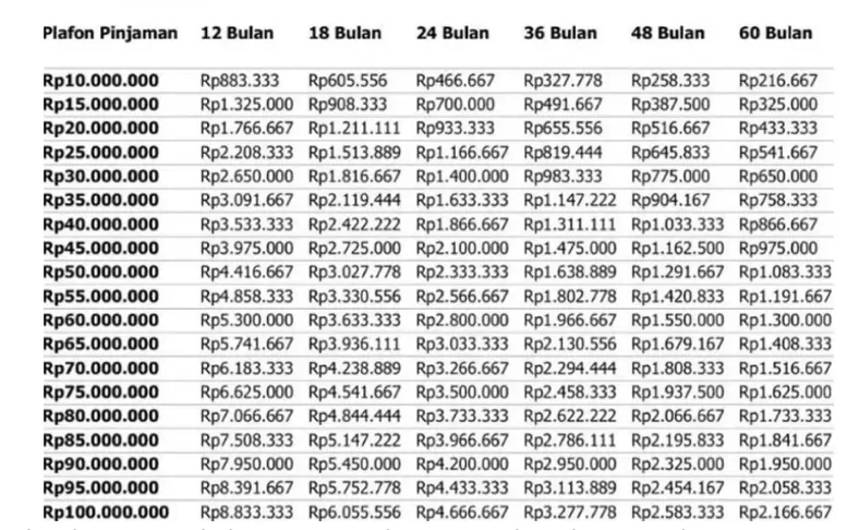 Berikut adalah tabel plafon dan estimasi angsuran bulanan untuk pinjaman KUR BRI: